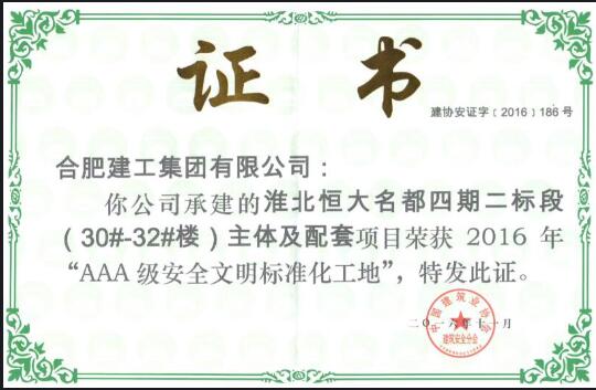 2016年AAA級安全文明標準化工地(淮北恒大名都四期二標段項目)